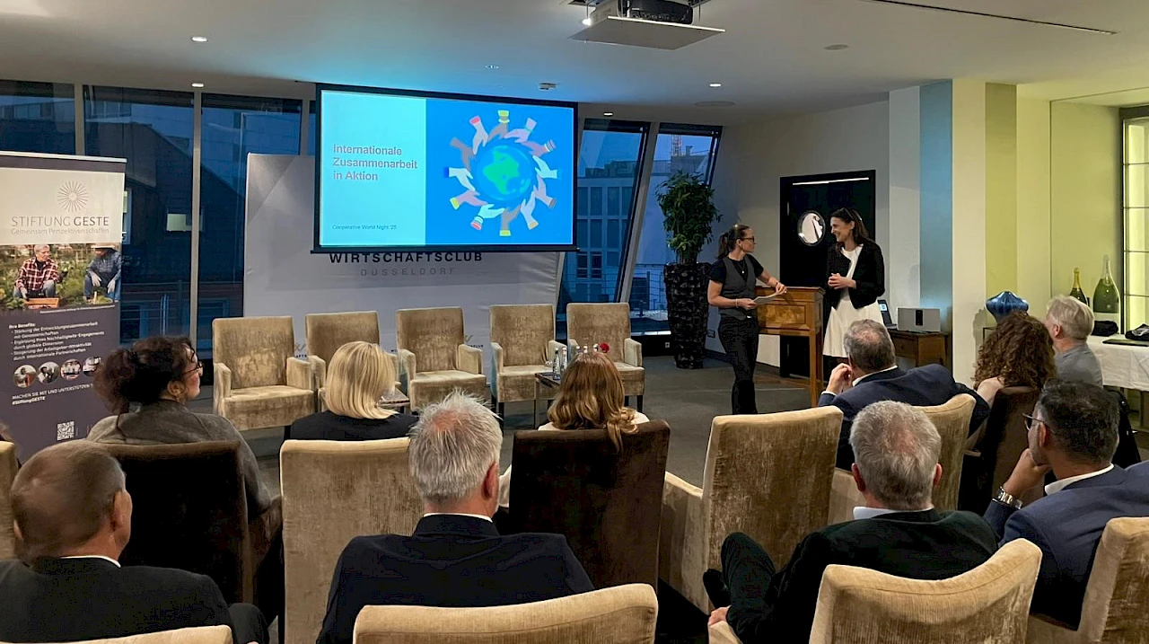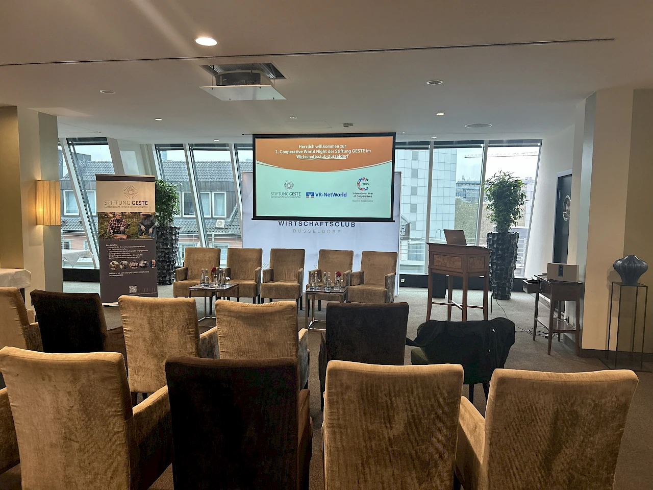 Besonders gefreut hat uns die Teilnahme zahlreicher Vertreterinnen und Vertreter aus dem genossenschaftlichen Netzwerk. Nach einer kurzen Begrüßung durch Steffen Müller (Stiftung GESTE & DGRV) und Alexander Doukas (VR-Networld GmbH) startete die Cooperative World Night mit einem Grußbotwort in Videoform von Hans Joachim Reinke, Vorstandsvorsitzender der Union Investment und der Stiftung GESTE. Auch Simel Esim von der ILO Cooperative, Social and Solidarity Economy begrüßte unsere Gäste mit einer Videobotschaft. Durch den Abend führte Vera Viehöfer (geno kom) mit einer souveränen Moderation.